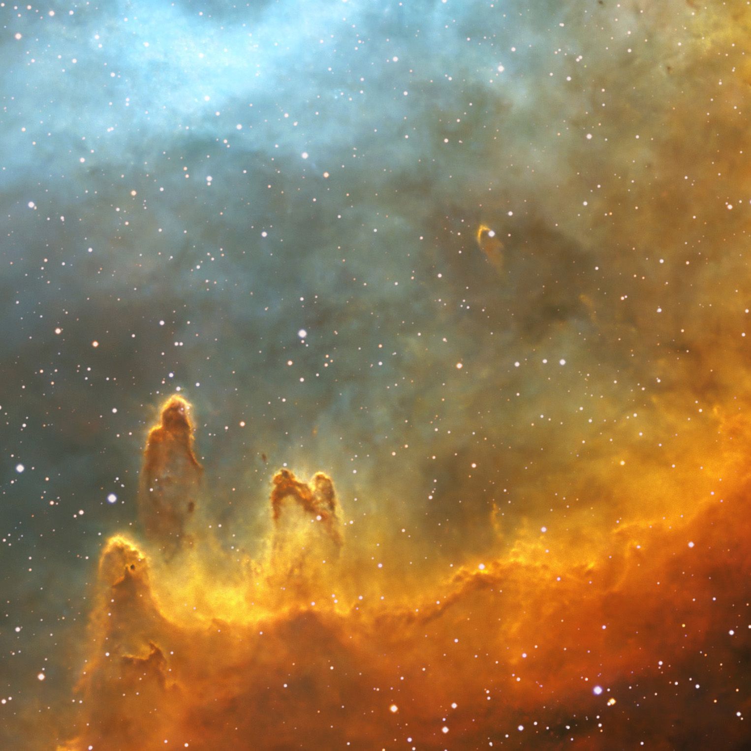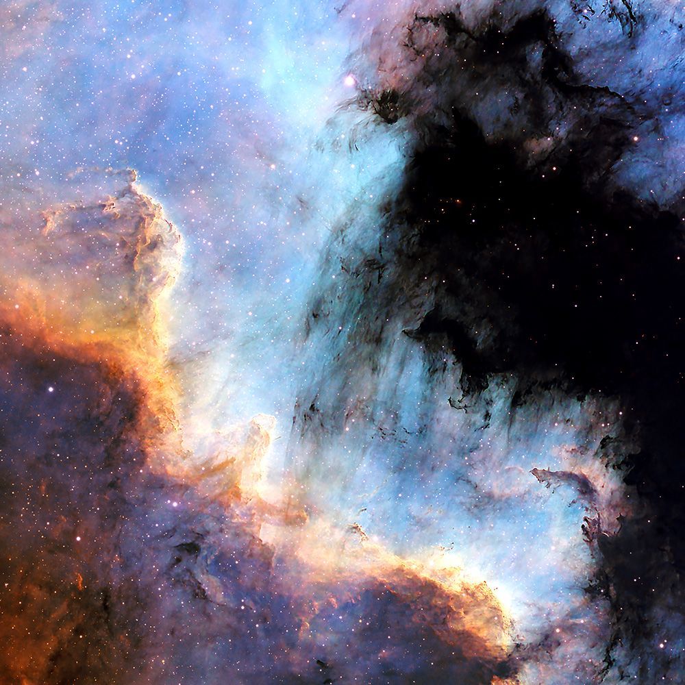 Part of the expansive North America Nebula, the Cygnus Wall is a towering region of active star formation. Here, powerful stellar winds and radiation carve the surrounding gas into bright ridges and deep shadows, revealing the drama of creation in the heart of the Milky Way.