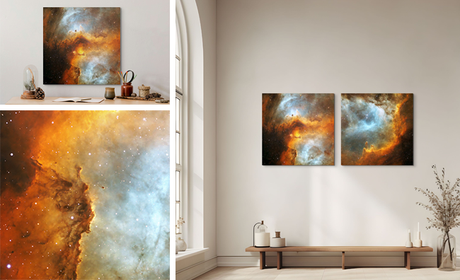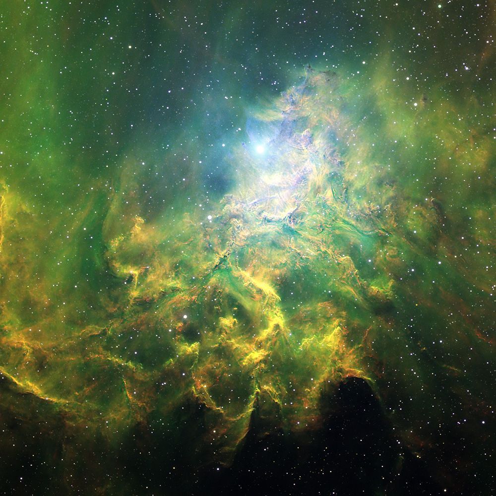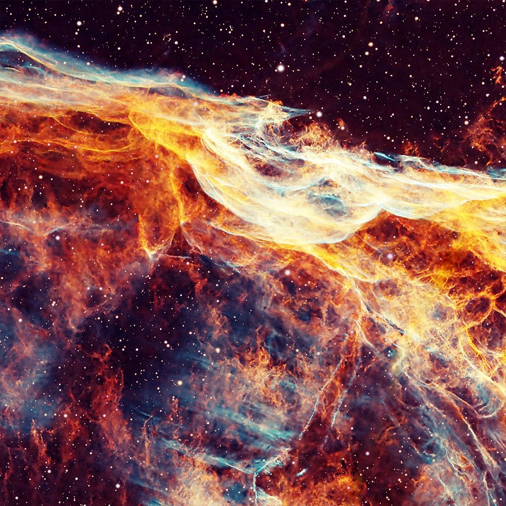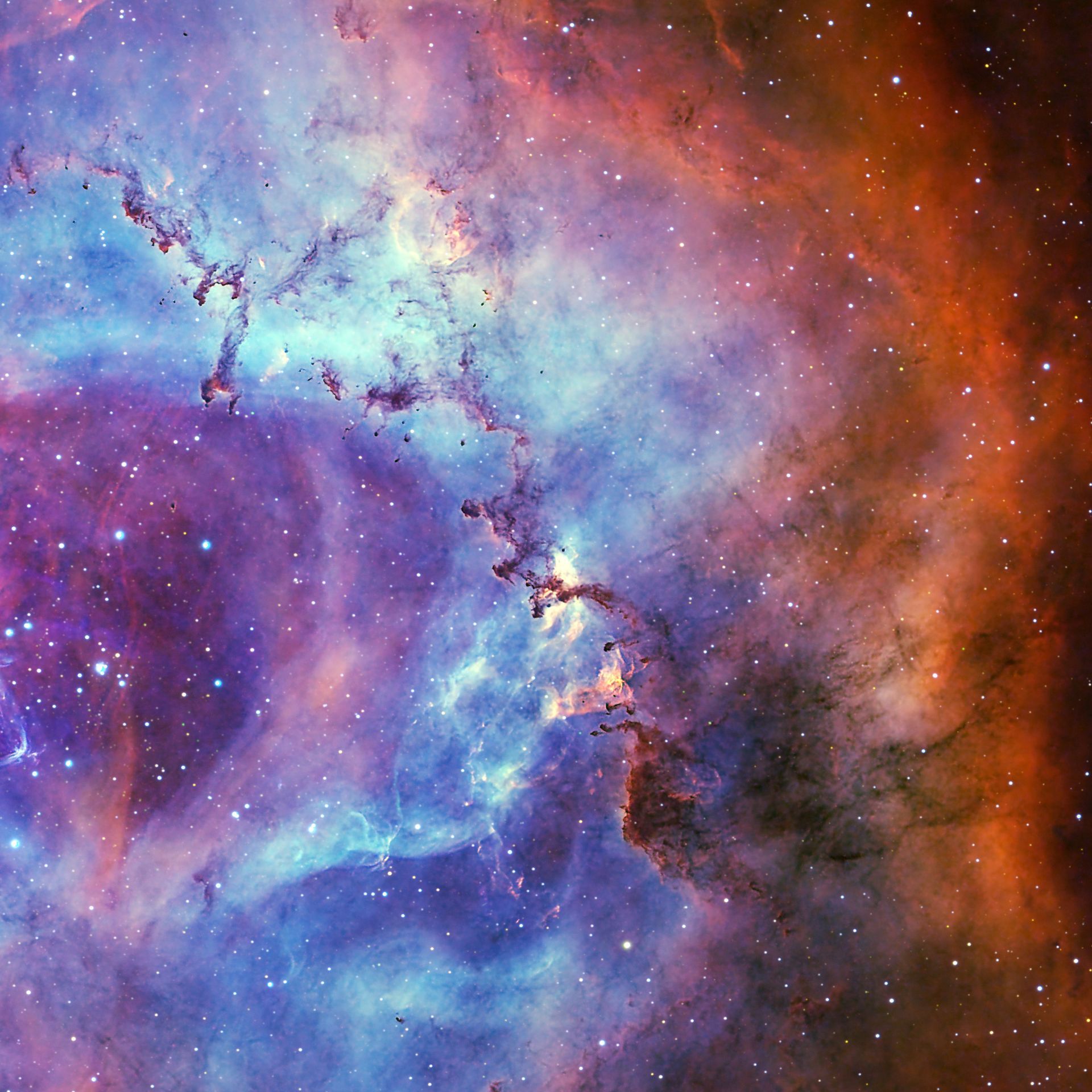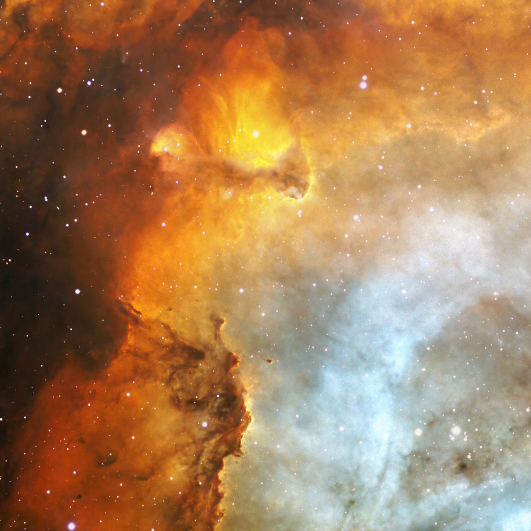 Shaped by the solar winds of newborn stars, the vast star-forming region glowing with deep warm shades and soft blue light. Captured here in great detail, this image reveals the heart of a stellar nursery where new suns are born.