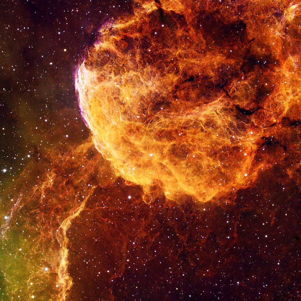 Named for its fluid, drifting shape, the Jellyfish Nebula is the remnant of a star that exploded thousands of years ago. Its radiant arcs and filaments stretch across hundreds of light-years, glowing in hydrogen light that reveals the quiet aftermath of stellar destruction.