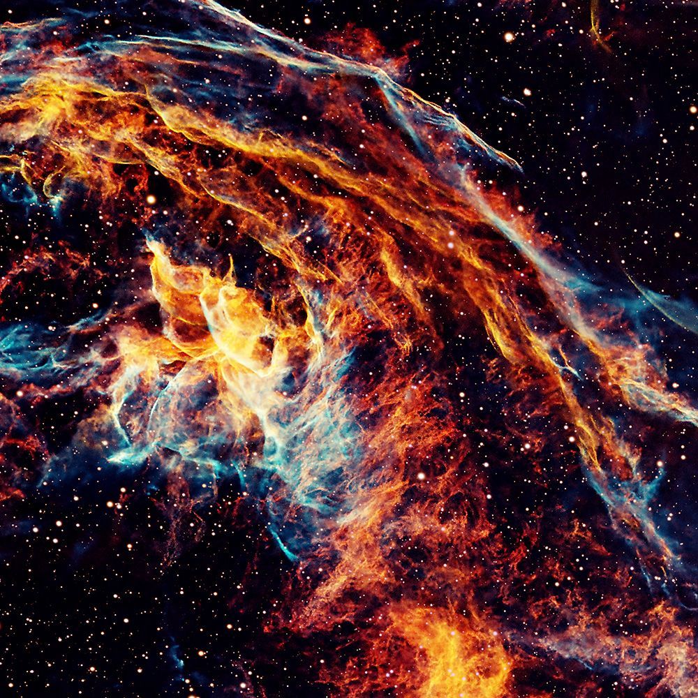 The delicate remains of an exploded star travel through space creating intense patterns and delicate strings of ancient stellar material.