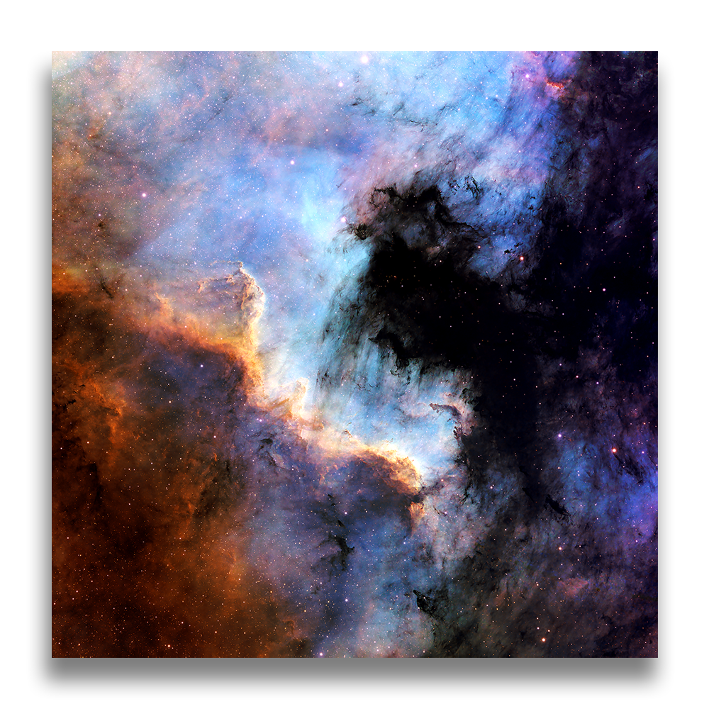 This is a portion of a larger region named the North America Nebula. Blue is Oxygen. The warm colors are Hydrogen and Sulphur.