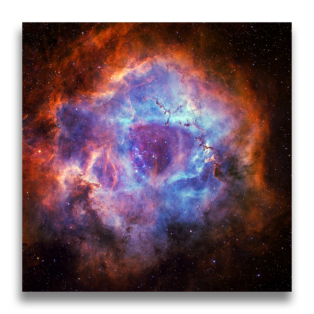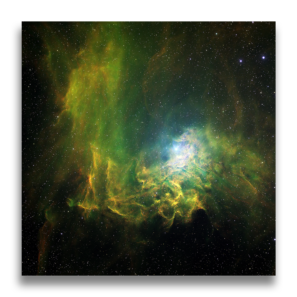 Imaged over multiple nights using Hydrogen Alpha, Sulphur II and Oxygen III filters. The warm colors consist of Hydrogen and Sulphur. The cool blue is Oxygen.