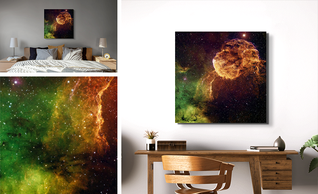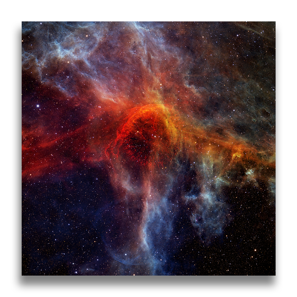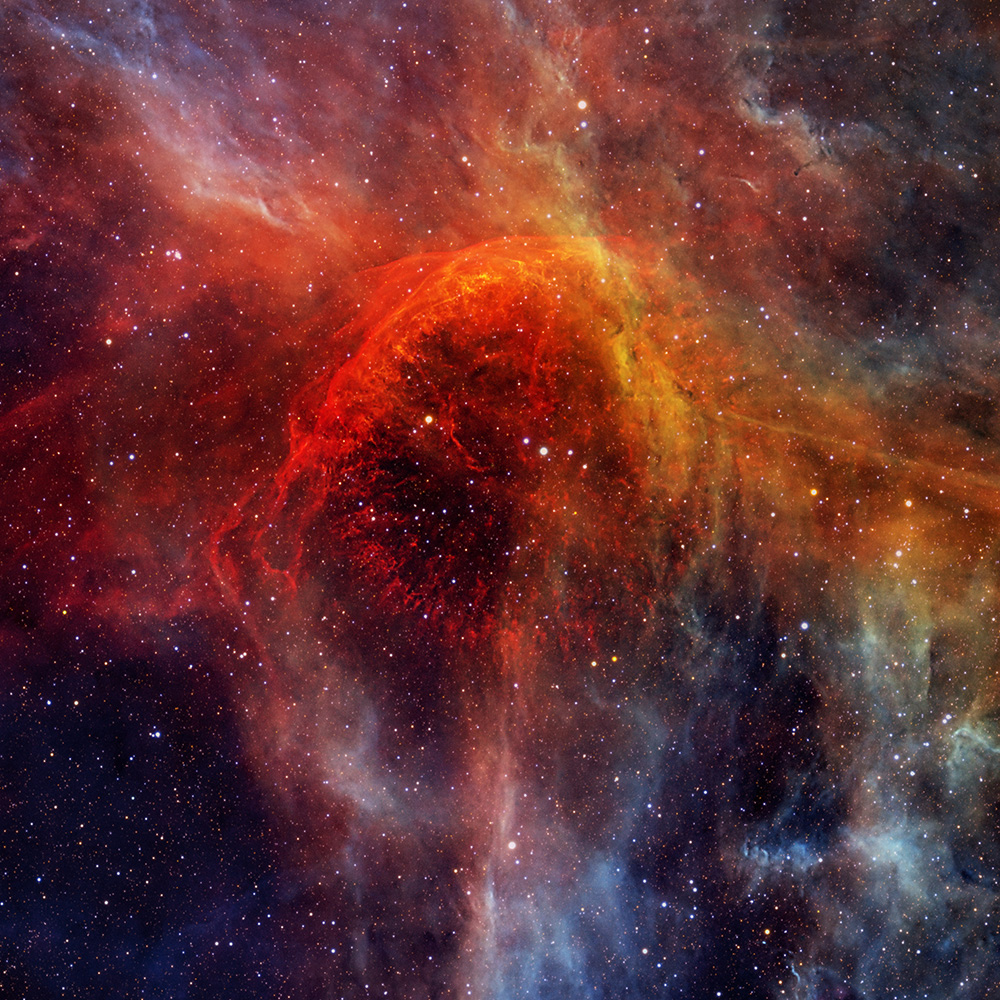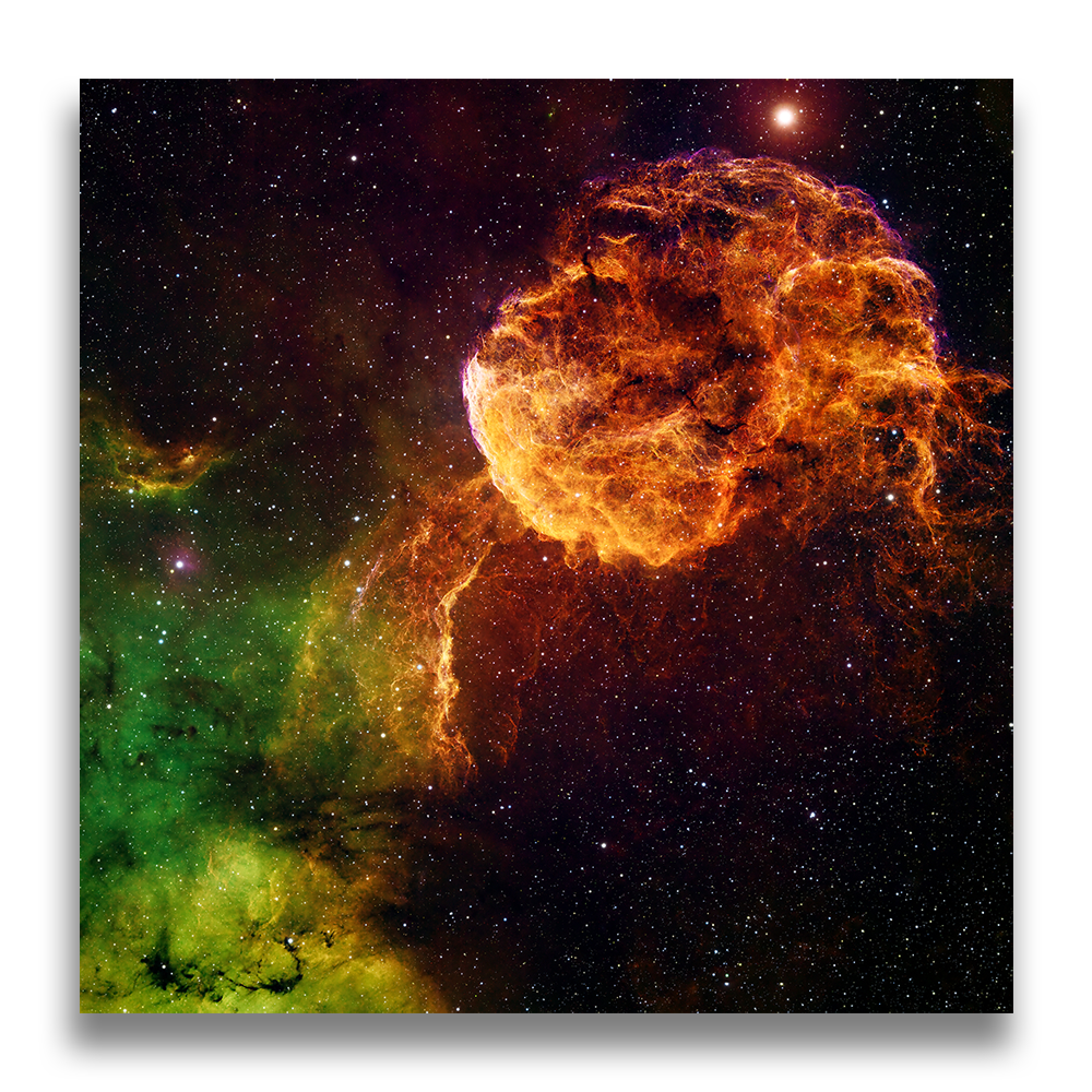 Named for its fluid, drifting shape, the Jellyfish Nebula is the remnant of a star that exploded thousands of years ago. Its radiant arcs and filaments stretch across hundreds of light-years, glowing in hydrogen light that reveals the quiet aftermath of stellar destruction.
