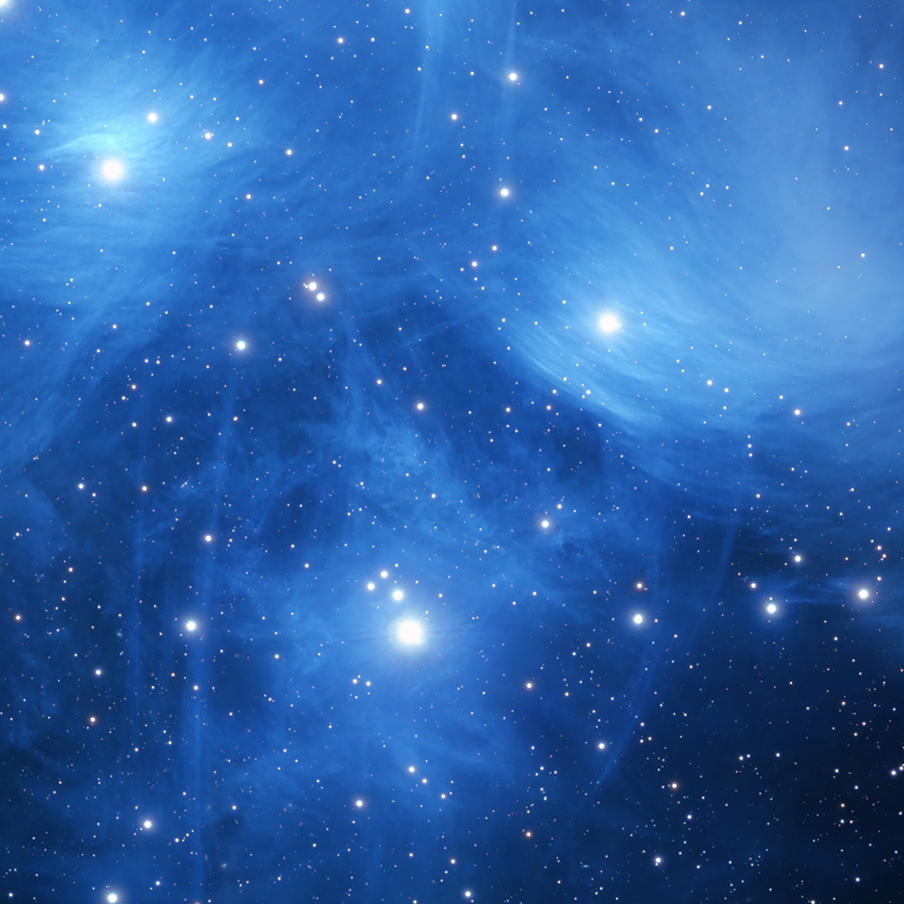 The Pleiades are one of the most recognized star clusters in the night sky — seven young, blue-white stars burning brilliantly, draped in wispy veils of interstellar dust.