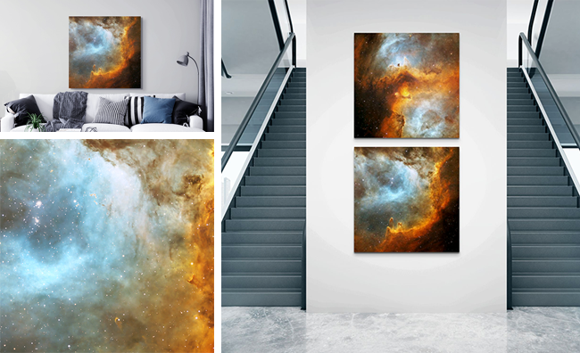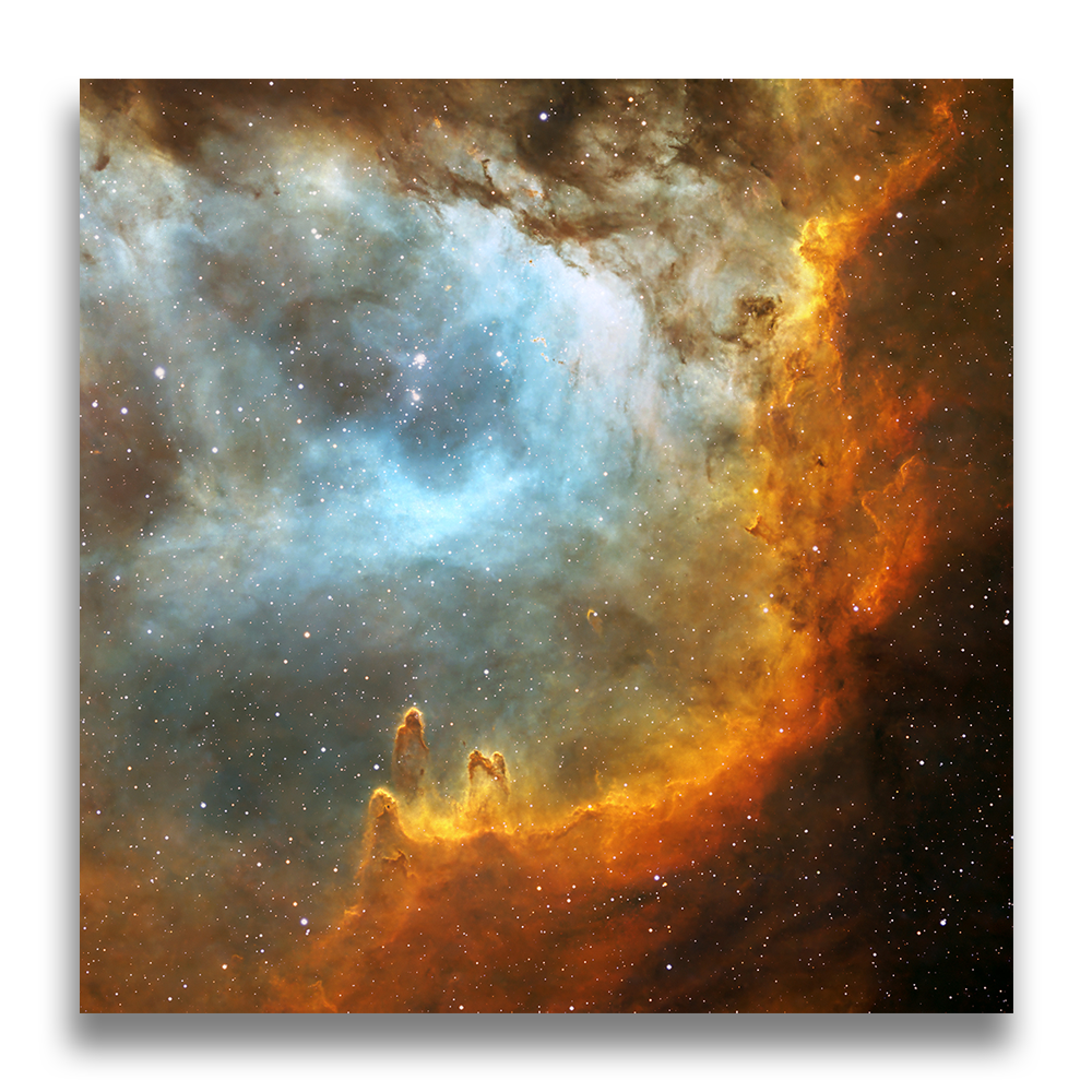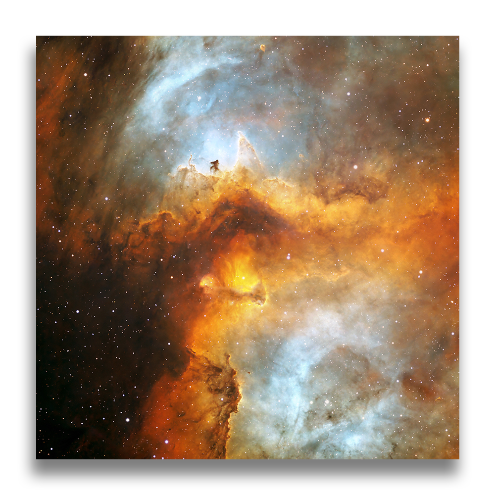 Shaped by the solar winds of newborn stars, the vast star-forming region glowing with deep warm shades and soft blue light. Captured here in great detail, this image reveals the heart of a stellar nursery where new suns are born.