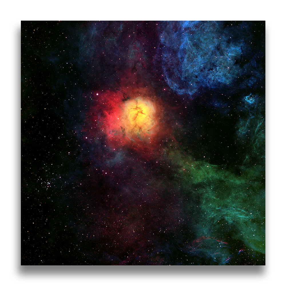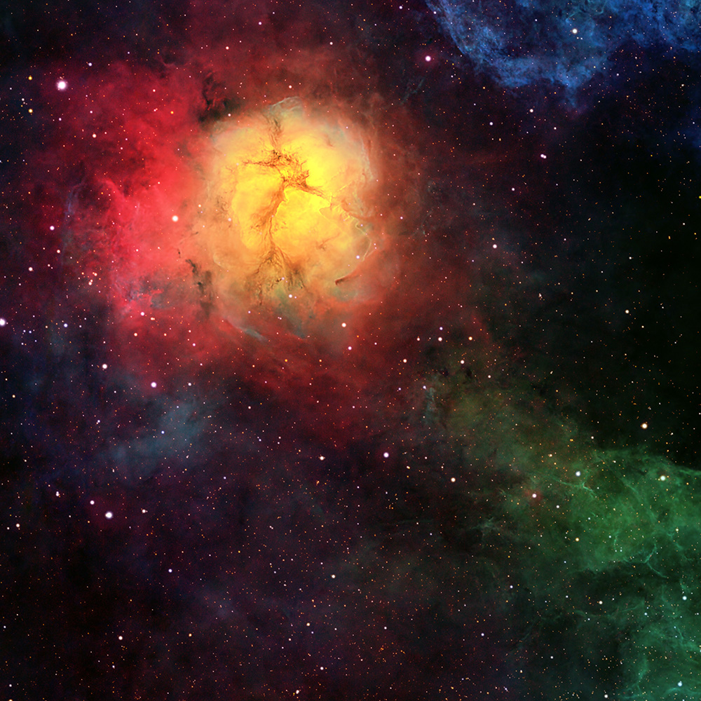 Although captured with the familiar Hydrogen-alpha, Sulphur II, and Oxygen III filters, the image’s color treatment is distinctly non-standard.